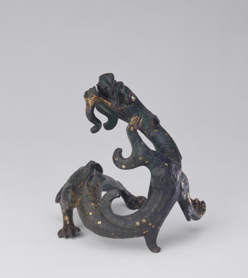 通高11.4厘米。器通体造型为一只凶猛的张牙舞爪的蟠龙。这只神兽似乎充满了力量,蕴涵着一种一触即发的强烈动势。 这件作品除对蟠龙动态的成功表现外,还有许多造型、装饰方面的特点。它脱离了单视点的正面构图方法,具备了可供人围观欣赏的立体造型,从不同的角度观赏此器,形成了许多既衔接完整又各自独立的生动画面。 龙头规整,躯干起伏,腿部坚实粗大,棱角分明,再加韧劲的长尾,锐利的尖爪,将蟠龙的形象表现得极其生动传神。