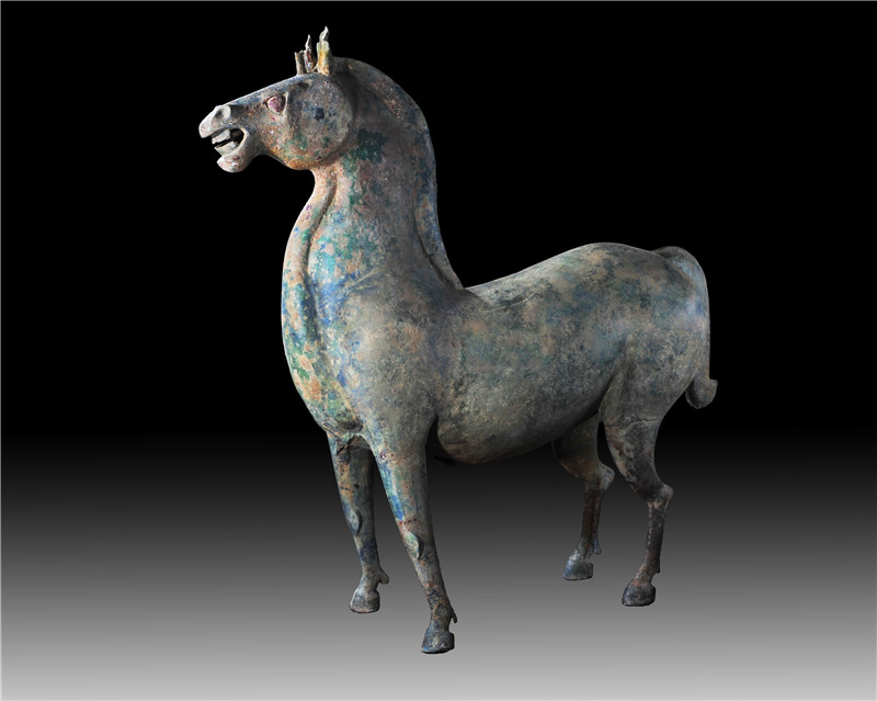 高163、长163厘米,重约两吨。2008年10月襄阳市樊城区菜越墓地出土。灰绿色。面颊平,双耳直立如削竹,两目凸出,翘鼻,张口露齿,双耳间立一扁长条状纛,额部錾刻有阴线流苏,长颈丰腴,上部有直立鬃毛,作引颈嘶鸣状。马呈站立状。两前肢微外张,后肢直立,马尾下垂。该马是目前国内出土体型最大的青铜马,堪称“中华第一青铜马”。