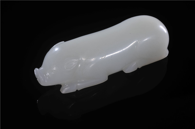 高3、长9.9、宽2.8厘米。2008年10月樊城菜越墓出土。玉握整块和田白玉雕刻而成。猪形,体呈卧伏状,眼、耳、鼻、口、四肢、尾巴俱全。四肢上有游丝线刻细毛。整器尽管小巧,但简洁大方,温润晶莹,完美无瑕。雕刻采用成熟的“汉八刀”,手法细腻,猪形憨态可掬,极富动感。