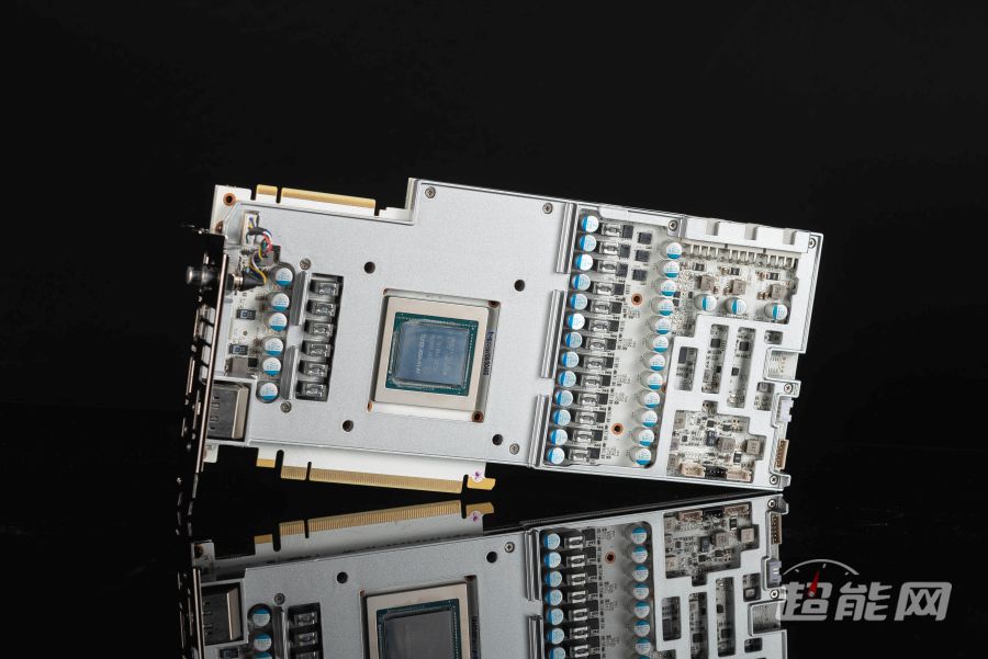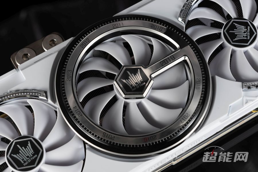 显卡具有金属中框,PCB是名人堂系列一贯的白色设计,作为高端产品线,采用的是12层的PCB,并优化电路设计,让减少信号杂讯、让信号更加纯净稳定。供电方面是16+3相的供电,其中核心16相供电,显存3相供电。