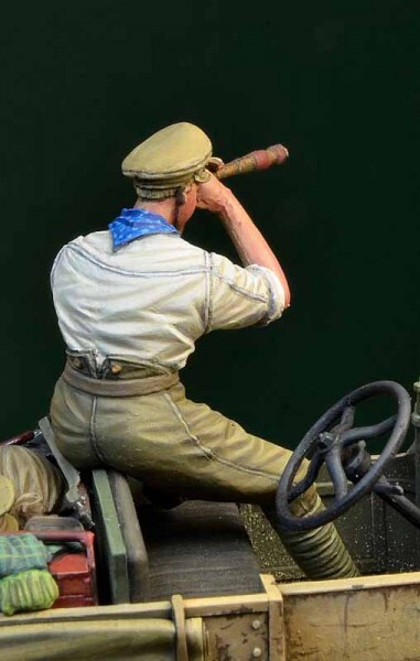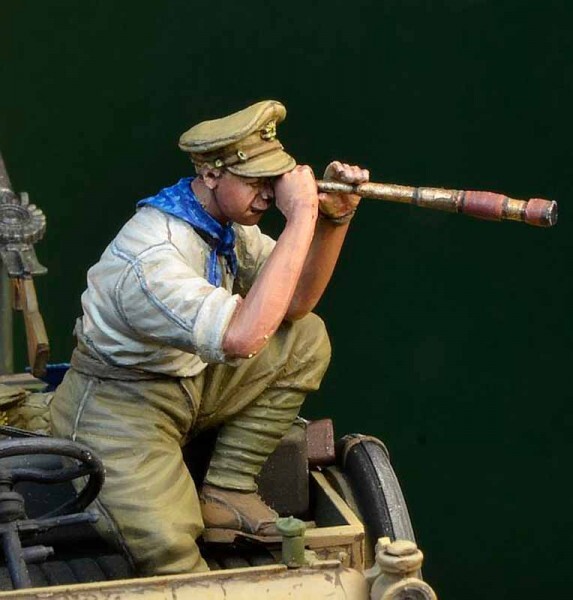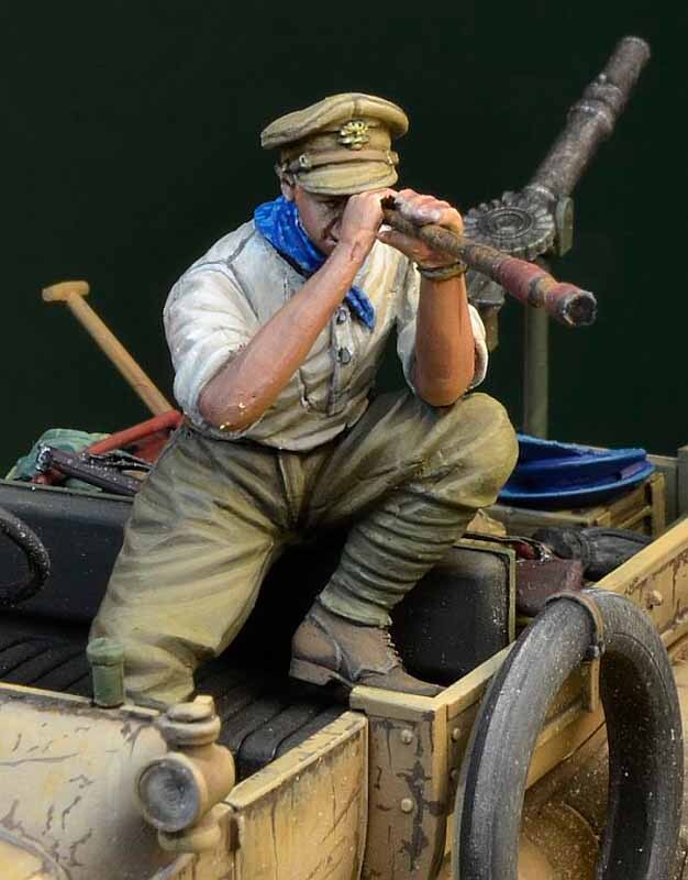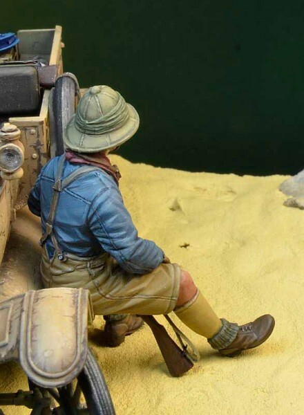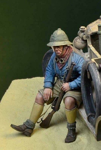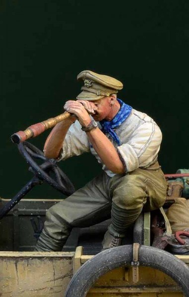 ●坐在车上观望远方的澳新军团军官,动作传神,蓝色围巾非常出彩。缺点是人物的小臂开模得稍偏长,面部表情不自然,单筒望远镜的精细度也有待提高。