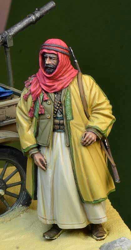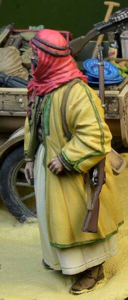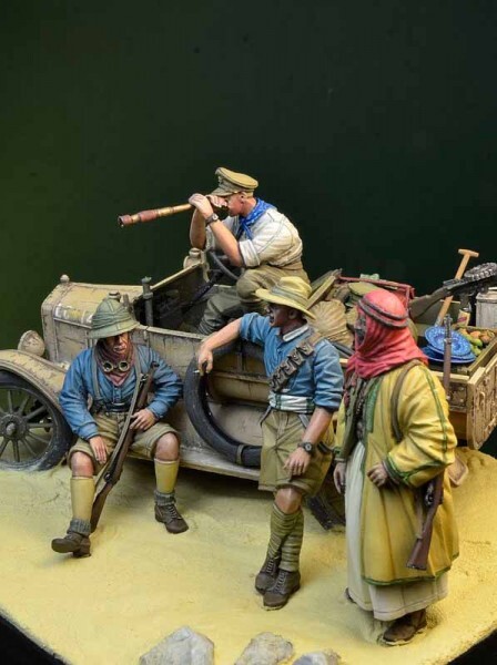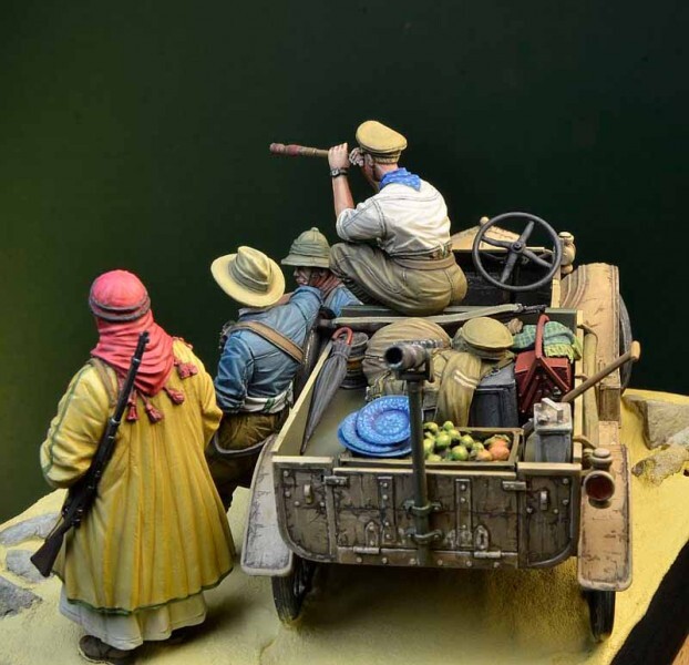 ●车辆的涂装上做了一定的旧化处理,以表现出沙漠气候下应有的特征:车轮和车体下部沾染的尘土,车体上斑驳的掉漆效果。人物的涂装比较吸引眼球,这得益于澳新军团士兵蓝色系上衣和向导的大红头巾,以及军官的金色望远镜和花围巾,这样的色彩搭配为场景增色不少。
