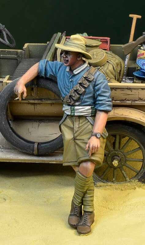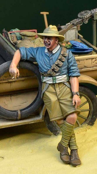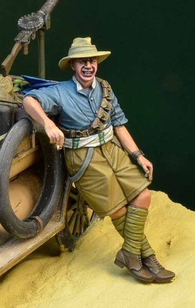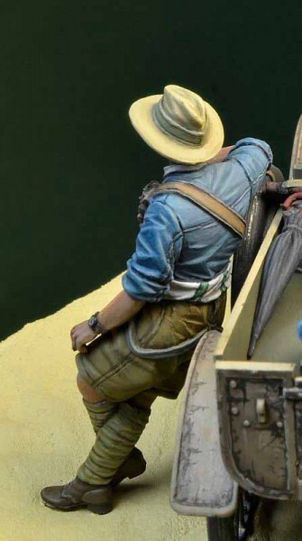●站姿的澳新军团士兵,这是本套开模动作最自然的人物,手捏香烟斜靠在车上的状态展示出休闲和放松的氛围,澳洲牛仔放荡不羁的豪情跃然脸上。