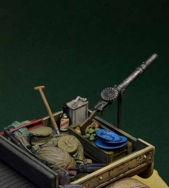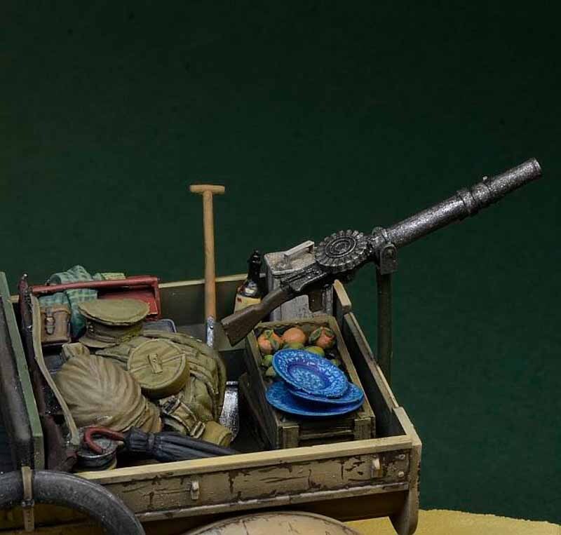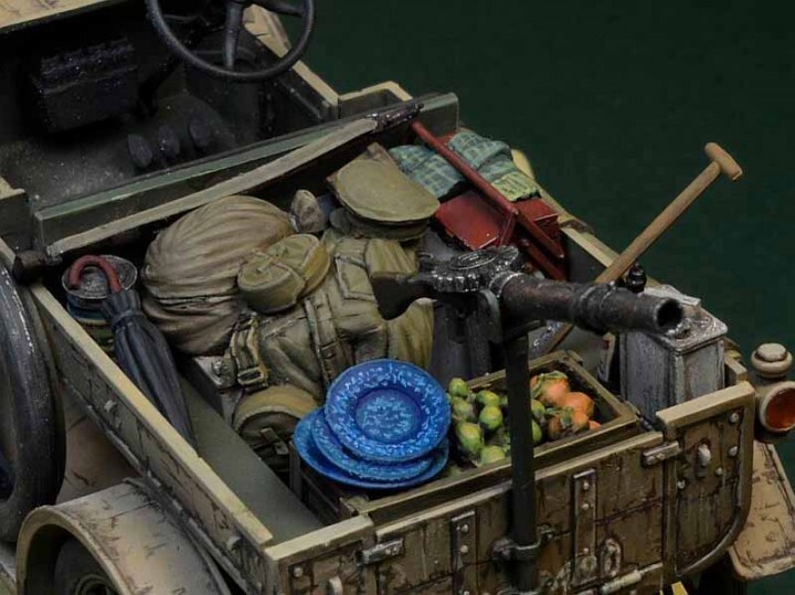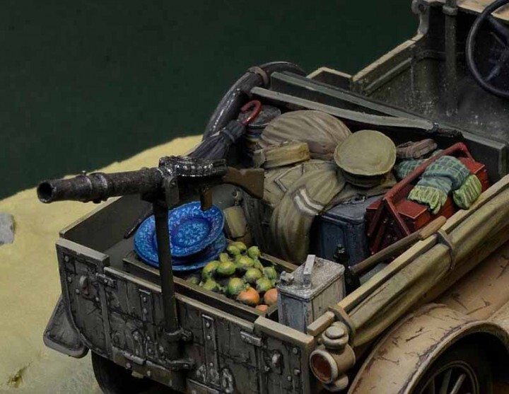 ●这套福特T型车的树脂装备补品是整个模型的亮点,为场景带来了亲切感和活力,尤其是蓝色调的餐盘能够在第一时间吸引观众的目光,并引发无限的遐想——它们是来自中东某个集市上的普通餐具还是盗自某个墓穴的古董?如果是后者的情况不太可能这样随意敞放着,不过万一这帮澳新军团大兵不识货呢?一切皆有可能。