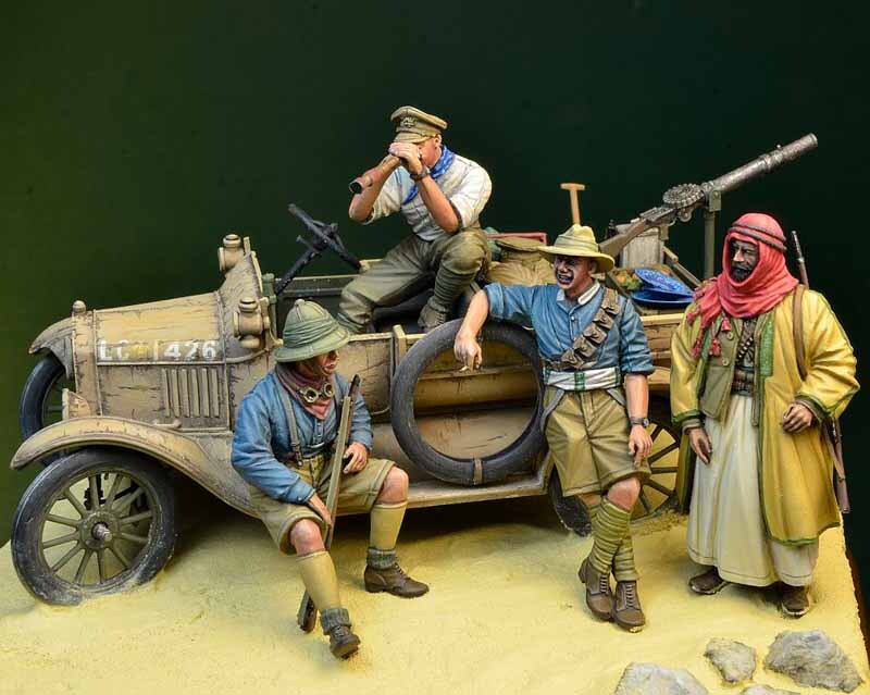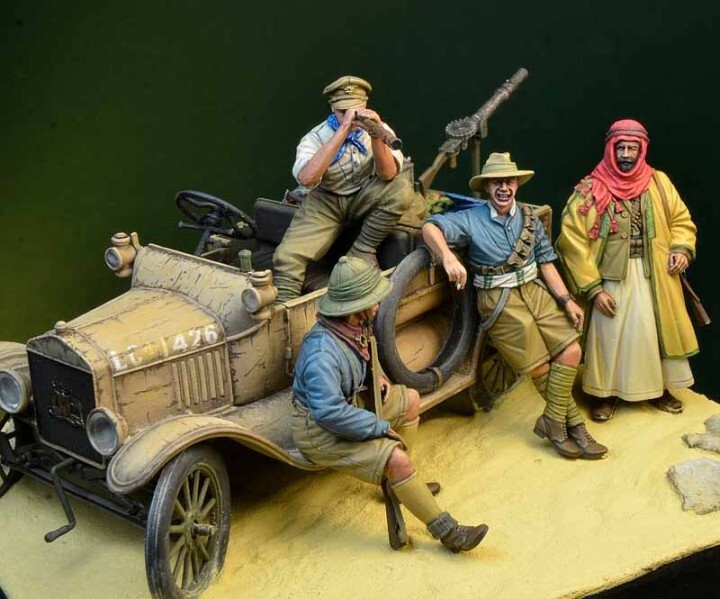 这次我们要介绍的是一个澳新军团小场景模型,故事发生在一战后期的中东沙漠腹地,主角是三名澳新军团士兵和一名当地向导,以及他们所乘坐的一辆1917年版LCP轻型巡逻车。场景的布局比较简单,小小的沙漠地台简洁清爽,只在前景处有几块裸露的石块,福特T型LCP横置于后,四个人物中的一人坐车上,另三人位于车前。坐车上的人看似是位军官,手拿单筒望远镜窥视远方,两名澳新军团士兵或坐或倚靠在车前,正在侃侃而谈,右边的阿拉伯向导流露出饶有兴趣的表情,估计是被两名士兵所聊的话题所吸引了。