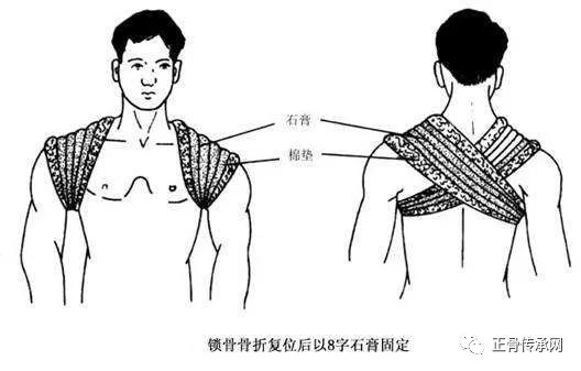 有移位锁骨骨折,须先行手法整复。明代朱肃《普济方·折伤门》就详细记录了古代骨伤科整复手法要领,即复位时,令患者坐凳上,挺胸抬头,双手叉腰,助手站立在患者背后,用膝部顶住患者背部正中,双手握患者两肩外侧,向后、上方徐徐用力拔伸,使之挺胸后伸肩,以矫正短缩移位,并能使骨折端向上、后、外凑对近另一骨折端。医者以两手拇、食、中指分别捏住两骨折端,用捺正手法矫正侧方移位,复位即告成功。
