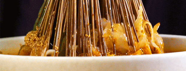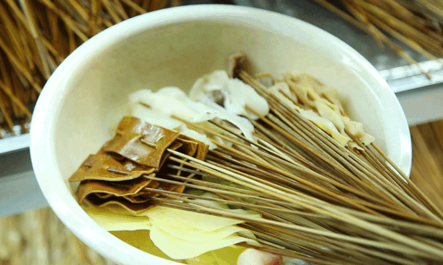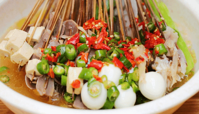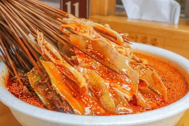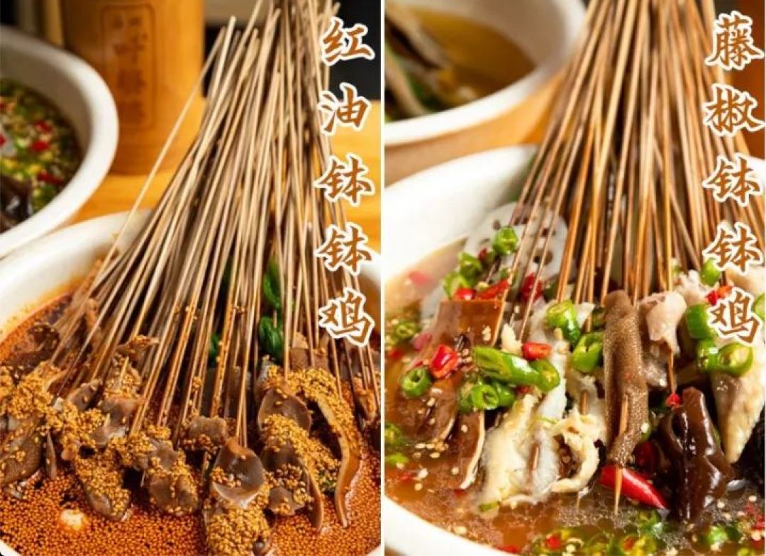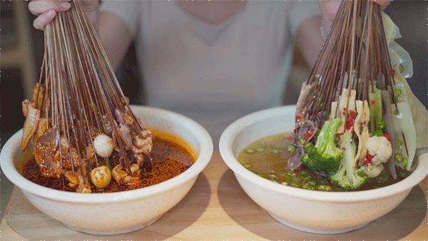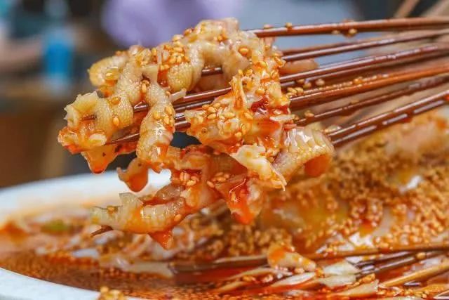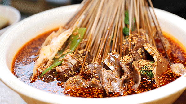 “钵钵鸡”起源于四川乐山,至今已有上百年的历史。用竹签将煮熟的菜品串起晾冷,再放入配以红油或者藤椒的秘制高汤,风味十足。
