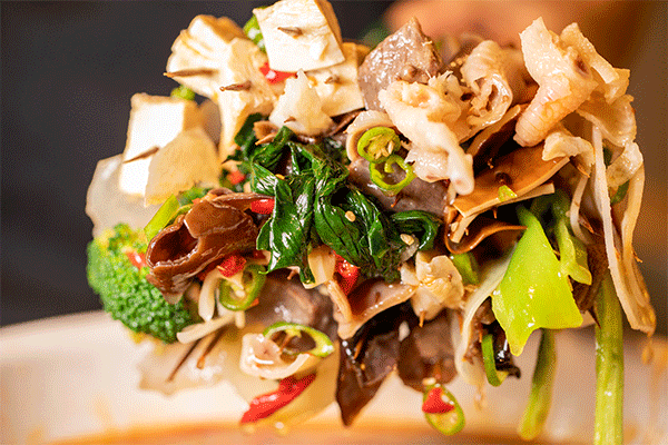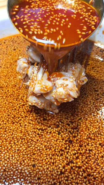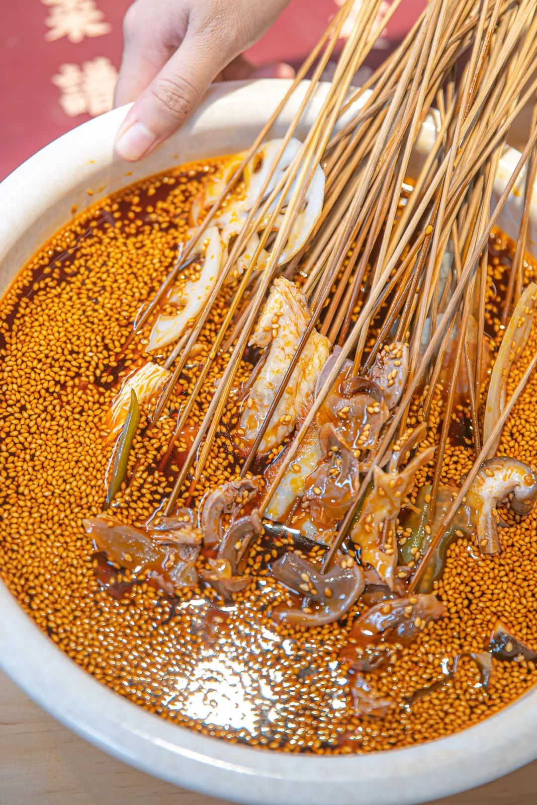 红油钵钵鸡是四川的经典口味,从乐山空运来的秘制调料撒上提香的白芝麻,不用靠很近就能闻到红油香味。