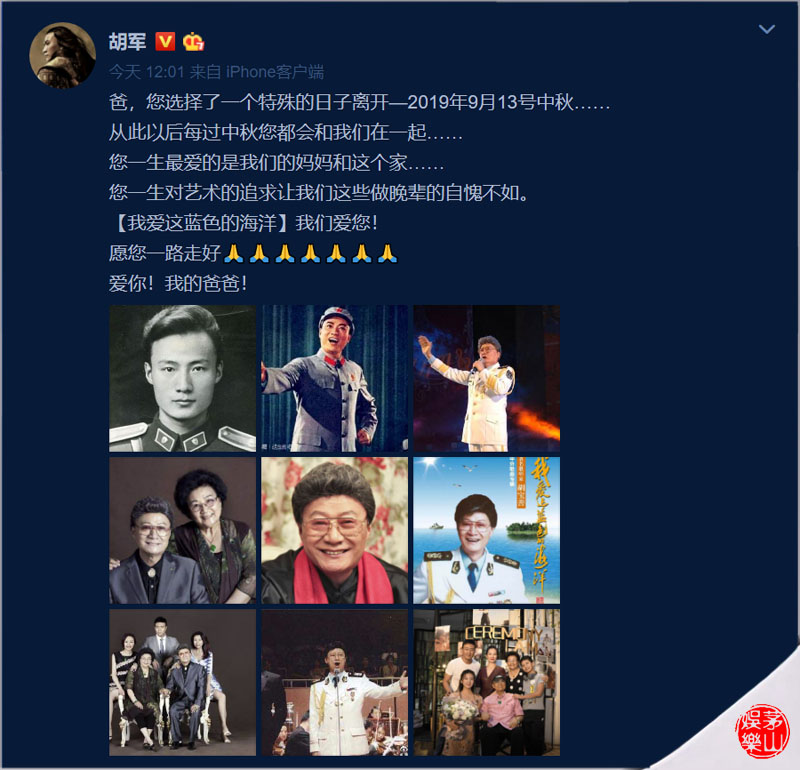 没想到3天后的中秋节当天,著名歌唱家、国家一级演员胡宝善与世长辞,享年84岁。14日12:01分,儿子胡军发文悼念父亲,配文是:“爸,您选择了一个特殊的日子离开—2019年9月13号中秋……从此以后每过中秋您都会和我们在一起……您一生最爱的是我们的妈妈和这个家……您一生对艺术的追求让我们这些做晚辈的自愧不如。【我爱这蓝色的海洋】我们爱您!愿您一路走好!爱你!我的爸爸! ”