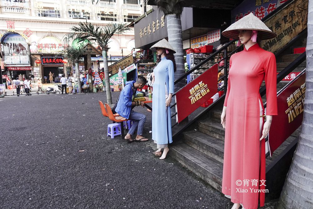 东兴市场街区并不大,像是一个繁华的县城。街区主要销售中越两国土特产、红木家具和工艺品。东兴口岸的街道上游人不多,越南人比国人多,可能是因为不是旅游旺季的原因。