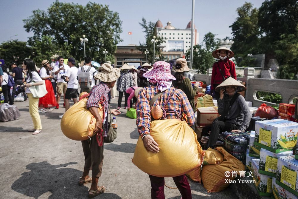 我们看见不少越南妇女到东兴这边来批发各类小商品,通常是一人弄几个大包,再拆开然后像蚂蚁搬家一样,来回搬到出境口岸安检处,估计口岸对面有人在迎接。