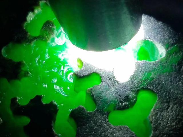 黄梨皮:梨黄颜色,皮薄,打光即可看见内含的颜色,切割后,绿色黄味足,显鲜亮活放,是大马坎最具代表性的块体。
