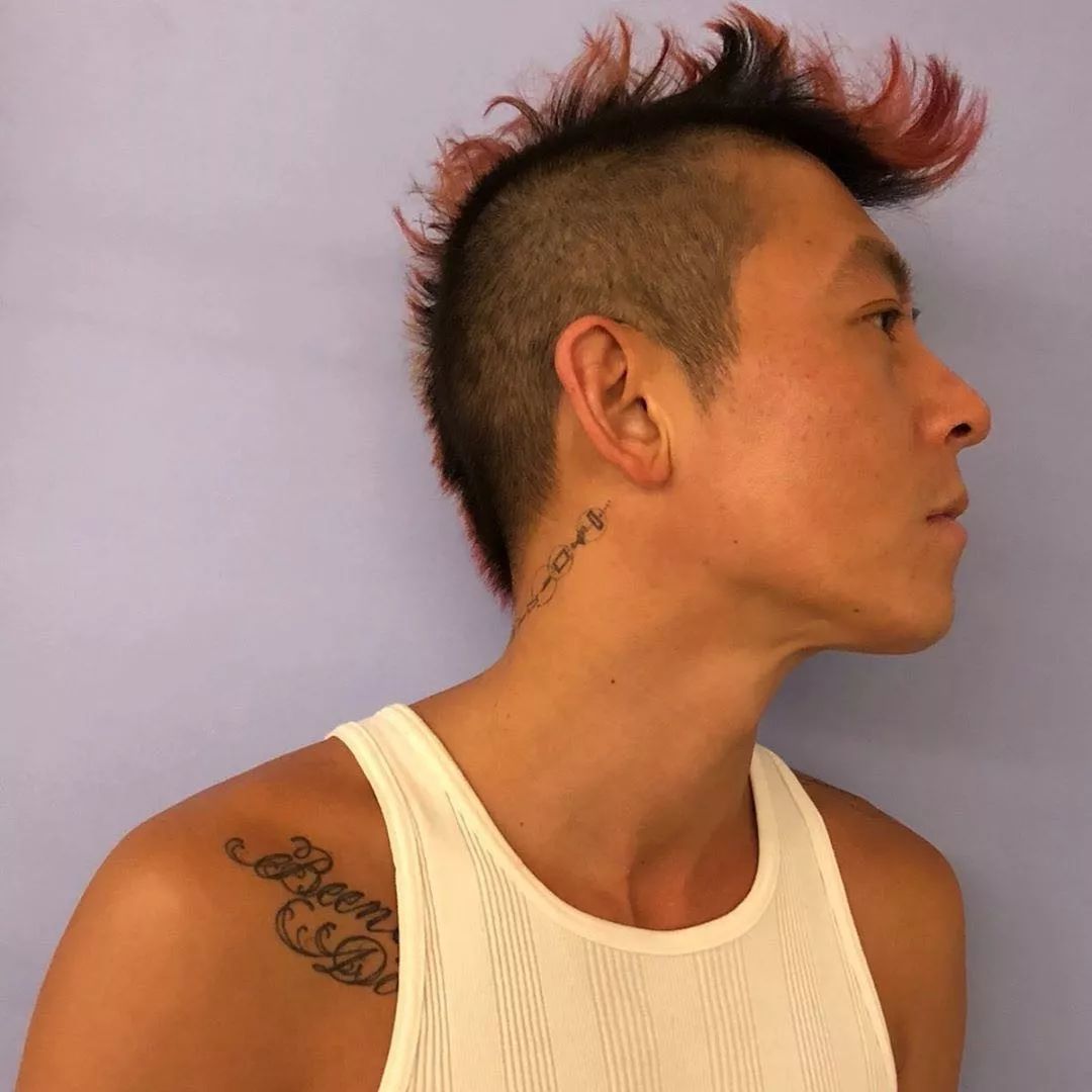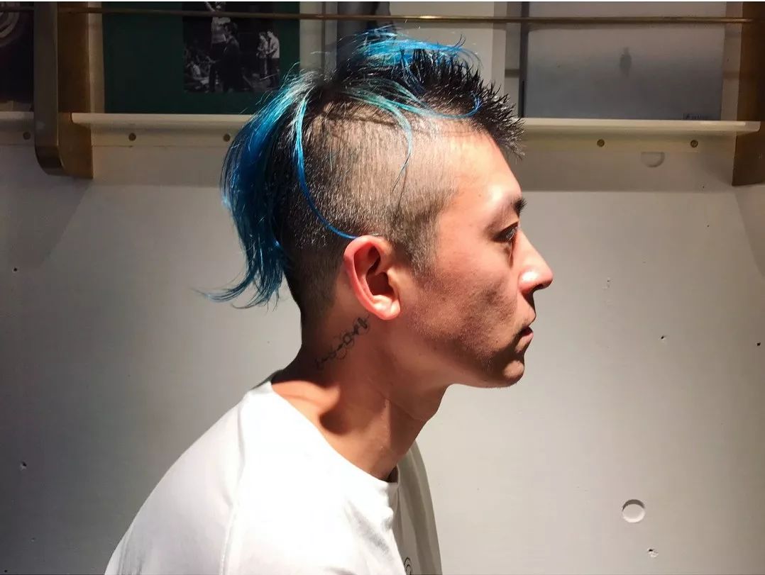 同样是染发,如今以一顶“红色莫西干”示人的陈冠希,很难不让人联想起去年的“蓝色挑染”造型。巧合的是,这两个发型都出自日本东京的“染发达人”AKI之手。 (毕竟EDC在香港和LA都有御用理发师,常去之地日本也必须安排上)