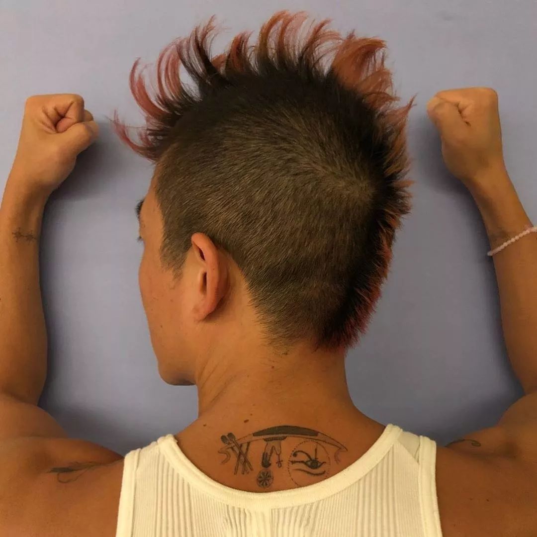 可以明显的看到,EDC的新发型依旧以Mohawk (莫西干) 为蓝本,一顿“锡纸烫”操作之后,外加选用棕红色进行挑染,实属霸气外露、骚出天际,让年近40岁的陈冠希看起来活力无穷,颇有梦回十年前的既视感,难怪连老朋友周杰伦看到之后也上前互动,连忙夸陈冠希“年轻”。