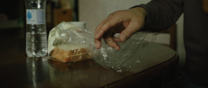 男主人公一边吃面包,一边将桌上的一只虫子弹走。