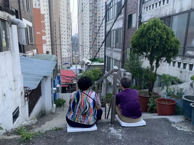 金美子奶奶(右)喜欢坐在楼梯上,迎着清风和朋友聊天。