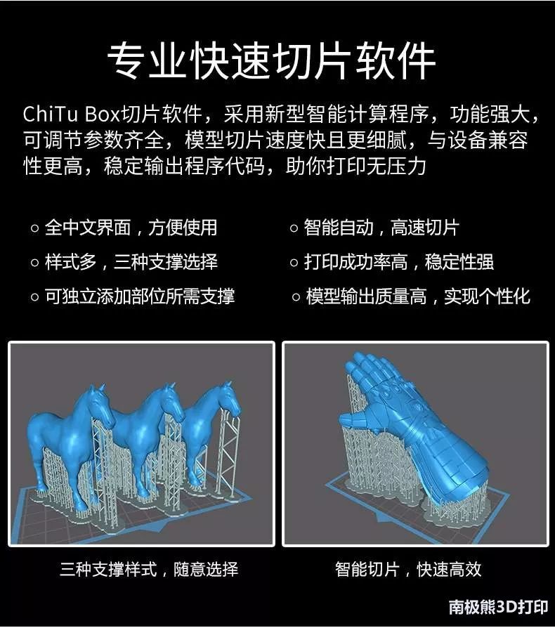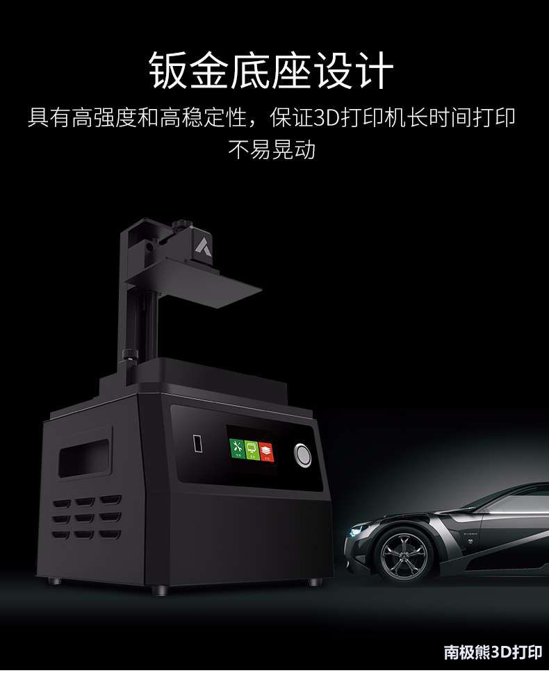 具有高强度和高稳定性,稳重的机身,重心下移保证3D打印机长时间打印不易晃动,面对光敏树脂的挥发气体,相比塑料外壳,钣金外壳更耐腐蚀,清洁工作方面钣金外壳更方便简单。