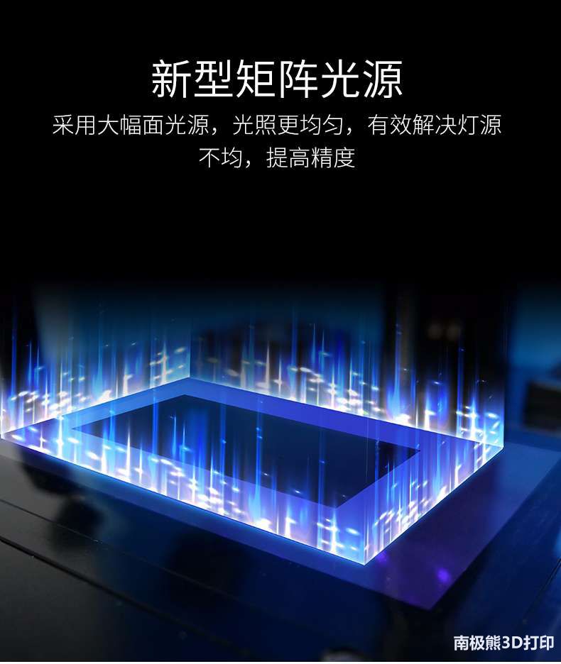 采用大幅面平行矩阵光源,紫外光照射更均匀,有效解决灯源不均,光源发散不平行的问题,助力提高G3光固化打印精度。
