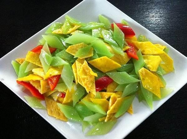 材料:莴笋、鸡蛋、蒜、料酒、盐、鸡精适量