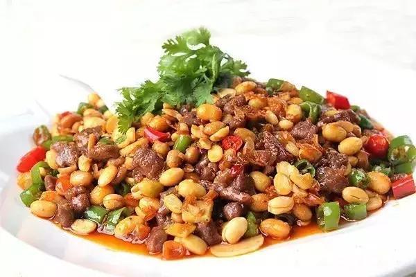 1、把牛肉切成小丁,加盐、料酒、生粉码味上浆;另把黄豆用清水泡涨后,再放到加有十三香和盐的水锅里,煮熟捞出沥水。
