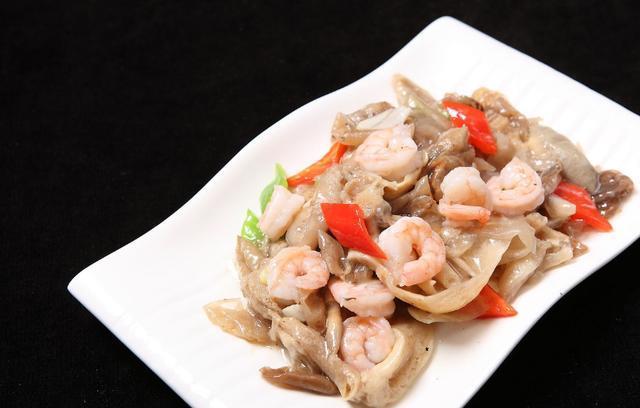 材料:鲜鸡地枞菌50克、虾仁150克、大刀豆10克、盐3克、味精1克、白糖2克、水淀粉8克、甜椒块、葱油、色拉油各适量
