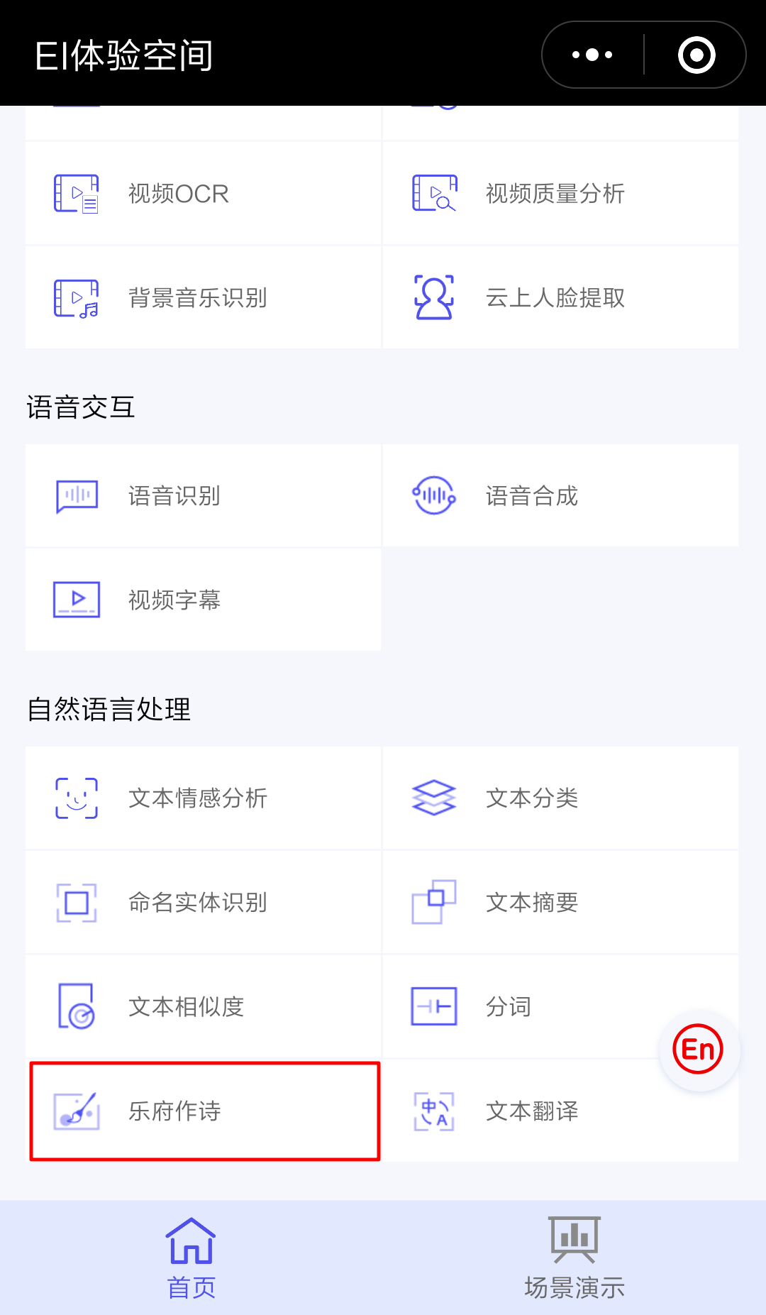 “乐府”的使用方法很简单,只需要通过微信搜索小程序“EI体验空间”,在里面就可以找到“乐府作诗”,打开之后,输入想要使用的标题,点击“开始作诗”,接下来作诗的事,就交给AI来完成了。