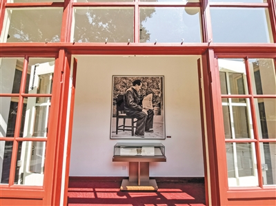 书架上安放的《资治通鉴》《辞海》以及鲁迅作品等书,都是毛泽东时常翻阅的。里间的办公室里,墙上贴着1949年北平大地图,桌上摆放着台灯。在灯下,毛泽东起草了179封电报,其中100多封是军事电报,指挥解放全中国。他还写下了21篇重要文章,包括《论人民民主专政》、“五评白皮书”等,为创建新中国做出了许多重大决策和理论准备。