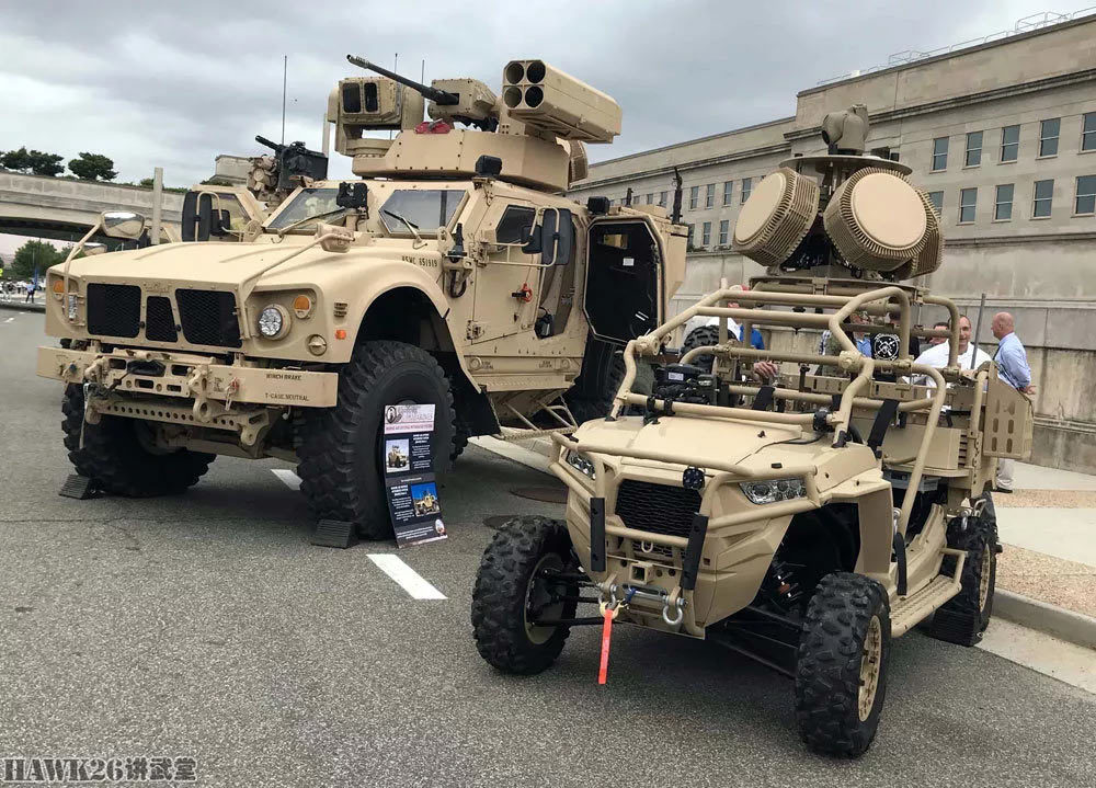 近年来,随着无人机越来越普遍地出现在热点地区和战场上,这种低(空)慢(速)小(型)目标对未来战场格局有着越来越重要的影响,因此美军对如何消灭敌方无人机非常重视。这是2018年7月,美国海军陆战队展示的“地面基地防空系统”,右侧为配备相控阵雷达和光电转塔的MRZR全地形车,左侧为配备30mm炮和四联装防空导弹的M-ATV。