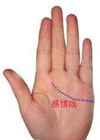 感情线——即天纹或父纹。从小指下掌边起向食指方向走,以走入食指与中指缝为中庸。