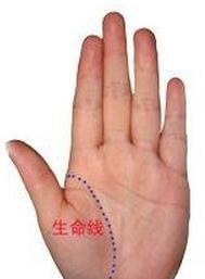 生命线——即生命纹。从大拇指与食指中间的掌边开始,往掌底走的纹路。生命纹的长短并不代表寿命的长短,而是代表生命力的强弱,所以生命纹其实应该叫做生命力纹。