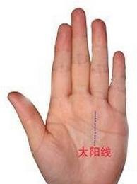 太阳线——在无名指下的直纹,与事业纹平行.若太阳纹成双线则称"名望纹"表示能在社会上有好名声。
