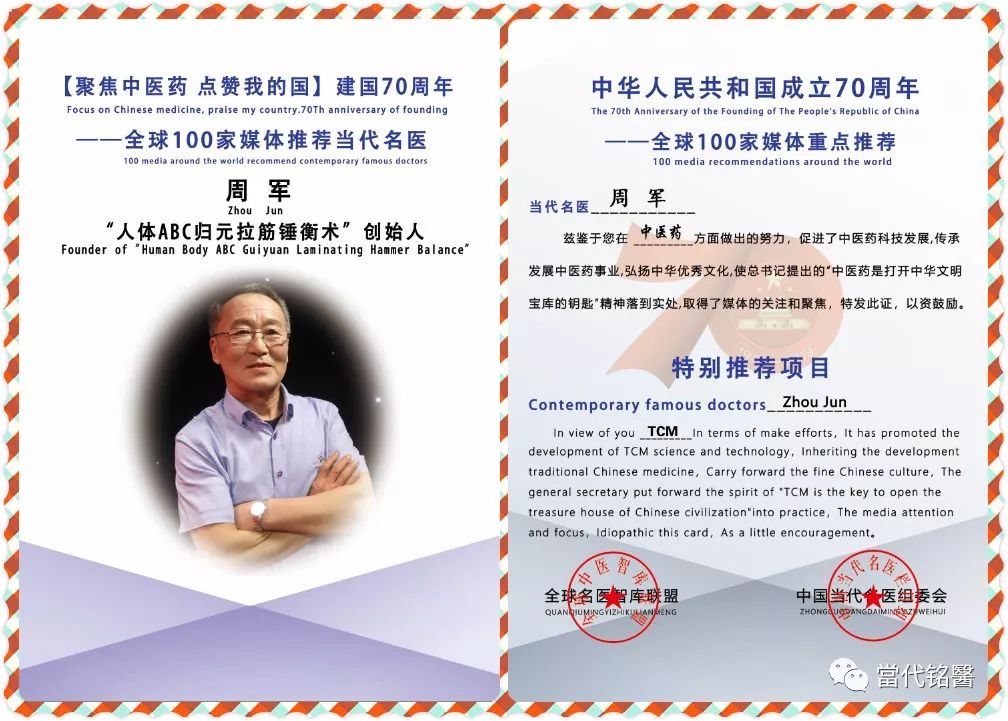周军获得《中国当代名医》聚焦中医药•点赞我的国全球100家媒体推荐当代名医