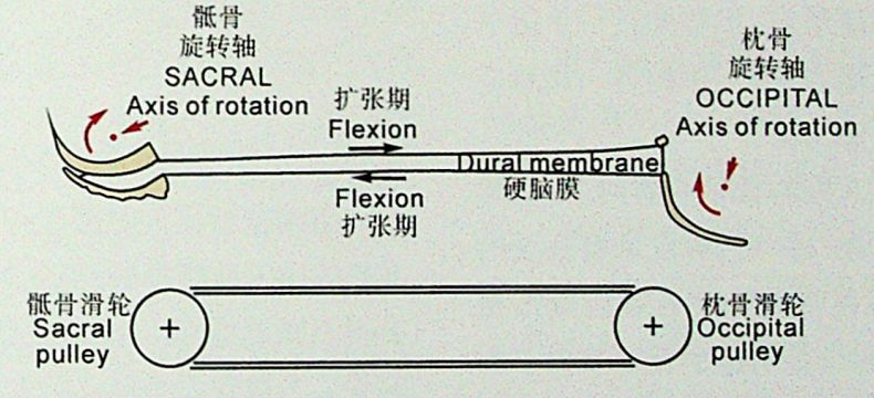 正常状态下,可以在颅骶上触诊到这种规律的脉动。在骶椎上触诊到的颅骶椎脉动运动方式是:以一横贯的轴为中心(第二骶椎下方约1寸),交替的往前、往后转动。这种前后转动的节律性运动,与头部横径交替的变宽变窄的频率是一致的。