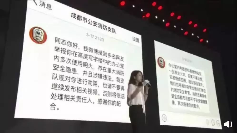 她在一次公开演讲中表示,公司曾接到过成都公安消防支队的警告,对方称接到多名网友举报,其在高层写字楼中的办公室内多次使用明火,存在重大消防安全隐患,并且涉嫌违法。