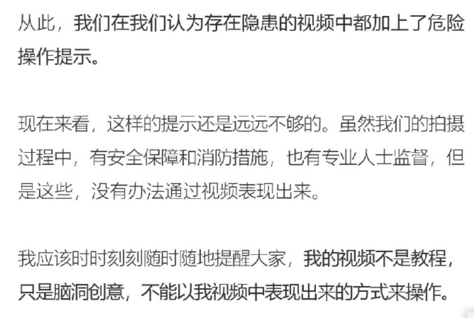 小野在9月10日微博发布的回应中也提到,虽然他们的视频在拍摄过程中,有安全保障和消防措施、也有专业人士监督。但这些,不仅没在视频中表现出来,也没有在视频中标注清楚。