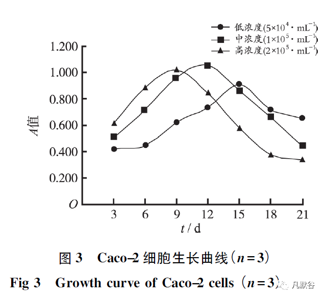 但接种不同细胞浓度的Caco-2 细胞生长曲线有差别: 细胞在低浓度( 5 ×104·mL-1 ) 接种时第15 天生长达高峰,A 值为0.905;中浓度( 1×105·mL-1) 接种时第12 天生长达高峰,A值为1.055; 高浓度( 2×105·mL-1 ) 接种时在第9 天生长就可达高峰,A 值为1.021。