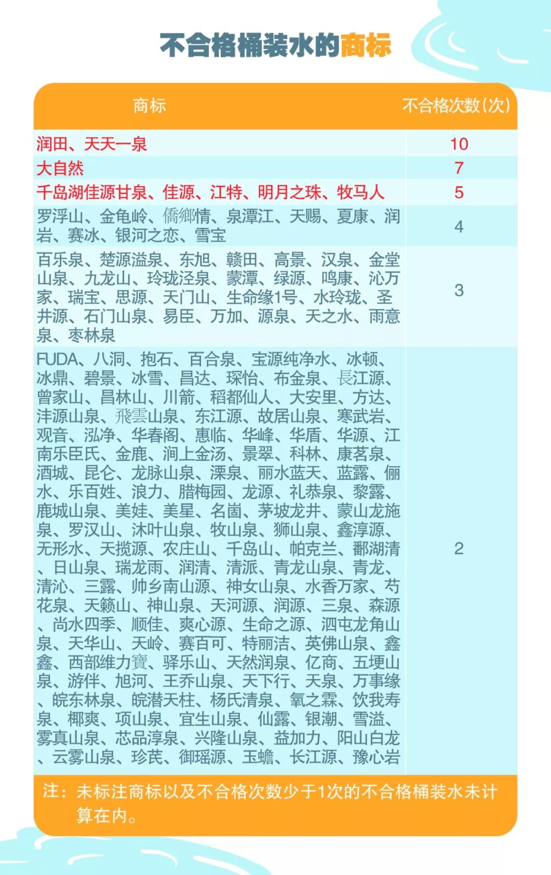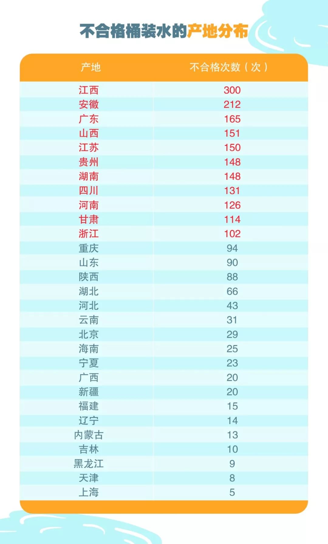 产地方面,江西、安徽、广东检出不合格桶装水最多;品牌方面,润田、天天一泉、大自然、千岛湖佳源甘泉、佳源、江特、明月之珠、牧马人多次上榜。