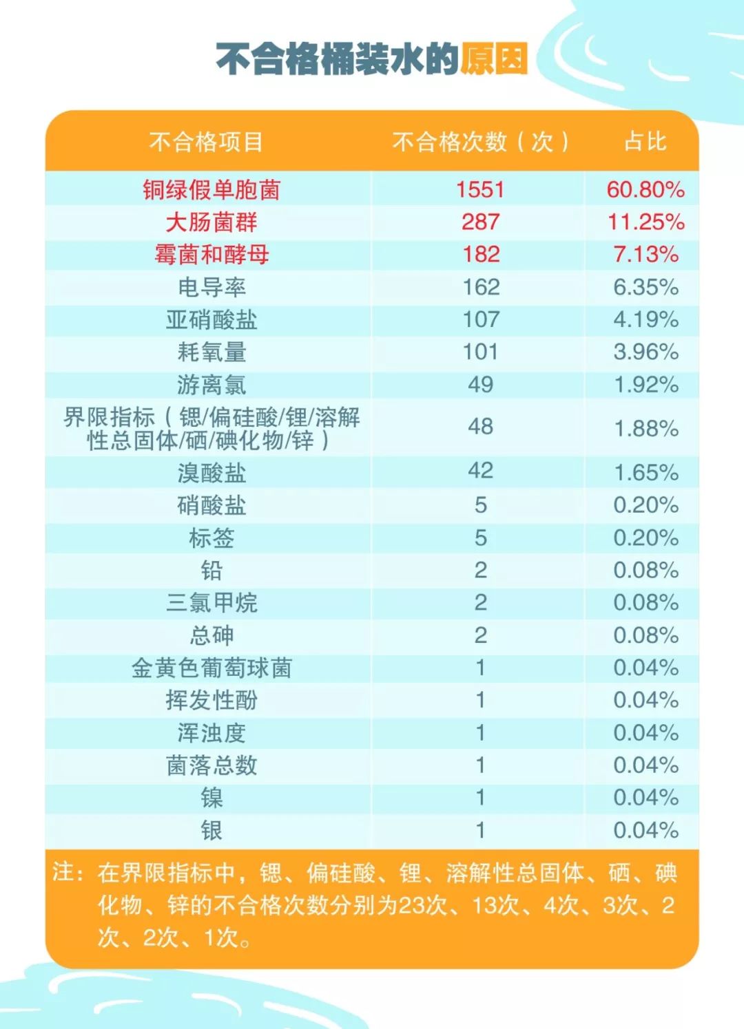 结果显示,5年内共检出2350批次不合格的桶装水,不合格的主要原因是检出铜绿假单胞菌超标。