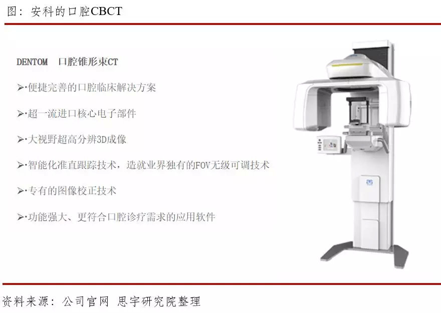 深圳安科成立于1986年,是中国最早被政府认定的高技术企业之一,目前产品涉及磁共振(MRI)、CT、口腔CBCT、乳腺机、DR、微创外科、专业影像工作站、高压注射器、PACS及影像云平台等。安科在2014年上市了一款口腔CBCT DENTOM,已取得CFDA注册认证。