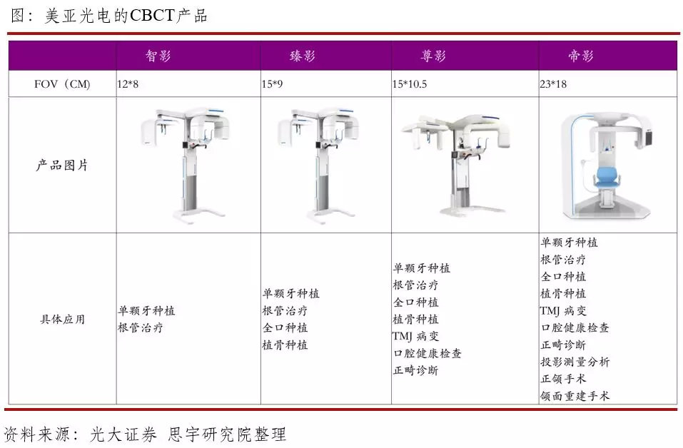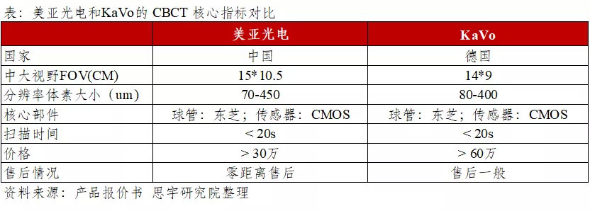 与此同时,随着不断的研发投入,美亚光电的CBCT 产品性能已经不输外资品牌,在产品参数上和外资领头羊KaVo基本没有本质区别,甚至在相似定位的产品中还可以做到更广视野。以两家厂商的中大视野CBCT为例,美亚光电的最大视野范围是15*10.5cm,而KaVo只能做到14*9cm;内部结构方面,美亚光电和KaVo的球管均采用日本东芝球管,传感器KaVo采用的是自主研发的 CMOS传感器,而美亚光电同样采用类似设备;扫描时间上,两者均小于20秒,分辨率等参数也几乎相同;但从售价来看,KaVo中视野CBCT至少60万元以上,而美亚光电最低则只需30万元左右,性价比优势明显。