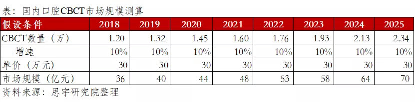 以目前CBCT市场存量规模12000台计算,假设CBCT单价为30万元/台,目前CBCT的市场规模约为36亿元。若考虑到未来CBCT的渗透率进一步提升以及平均5年的更换周期,假设以年化10%的增速计算,到2025年,国内口腔CBCT的市场规模有望达70亿。