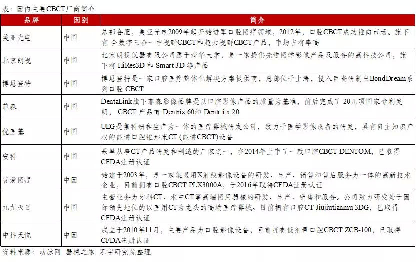 目前,国产CBCT厂家主要包括美亚光电、北京朗视、博恩登特、菲森、优医基等。国产品牌起步较晚,2012年美亚光电、北京朗视相继推出国产CBCT,才正式拉开国产序幕,此后菲森、博恩登特等国产公司也开始生产CBCT,相较于外资品牌,国产品牌定价更低,约为20-40万元,但由于成像效果不够清晰,市场反馈一般,目前仍主要集中于中低端市场。