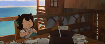 而化身成人形的小黑也无比可爱,这大口偷吃的表情以及饭饱后的满足感,真的能让我们找到那种最初的、最单纯的满足感。