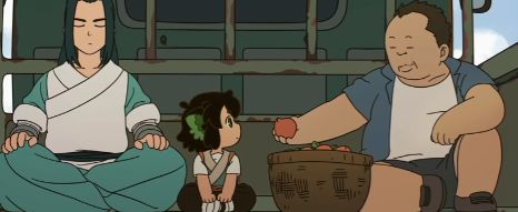 一人一妖泛舟于河面、穿梭在山水之间。坐在火车顶上看日落,骑摩托车走过麦田,在傍晚的大树下一起点起篝火。