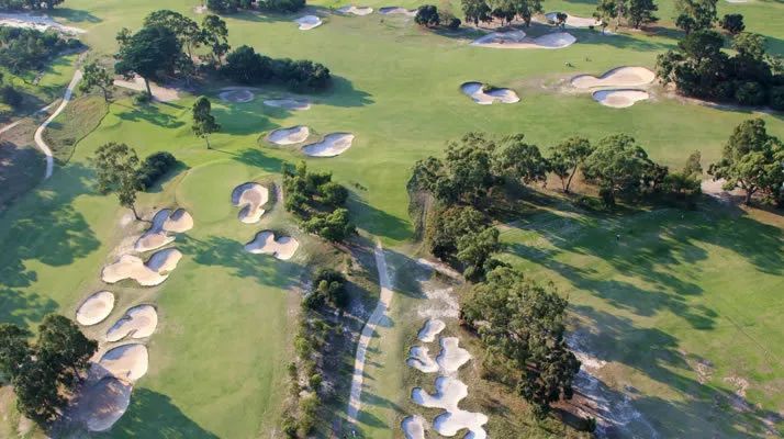 以黄金沙带区(Sandbelt)而闻名于世,墨尔本东南边绵延的狭长地带已成为了高尔夫建筑艺术黄金时代的缩影。富有沙质底层土壤的土质脉络为建造优质球场提供了天然条件,连绵起伏的沙丘制造了一系列具有惩罚性与挑战性经典球道,一路攀升至广阔的沙坑保护果岭。