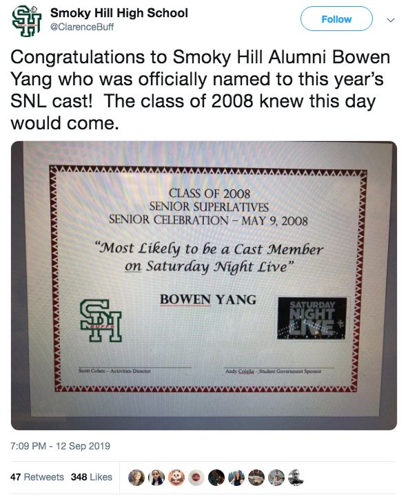 但是他的高中同学在11年前就预测到“这一天会到来”。消息见报之后,这位29岁的喜剧演员曾就读的Smoky Hill high school,在其推特上向他表示祝贺并贴出了2008年高中华业时,杨被同学们评为“最有可能成为周六夜现场秀的演员”的奖状。