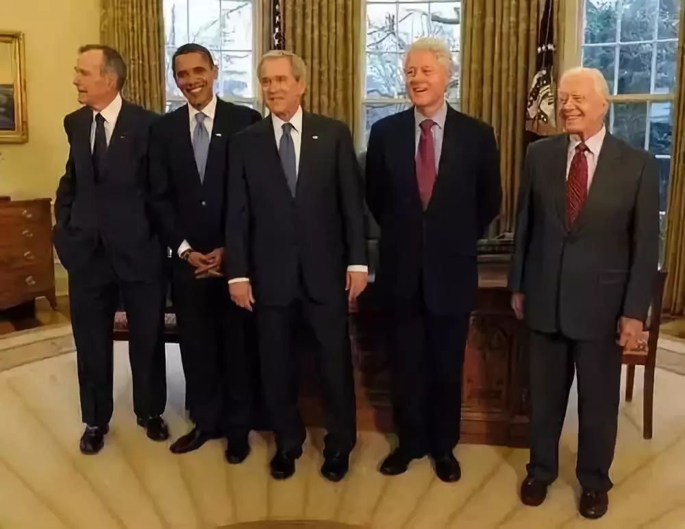 从左至右老布什、奥巴马、小布什、克林顿、卡特。面对喜欢“搞事情”的现任总统特朗普,美国人民看了这张合影恐怕会颇有感慨。