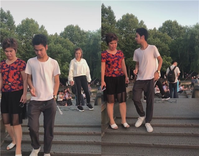 这时小吴妈妈发现了有路人在拍照,有些介意,频频看向镜头,而小吴好似全然习惯了在日常生活中有镜头对着自己,只见他十分淡定地收起手机,走回妈妈身边,母子俩继续慢悠悠地散步离开。