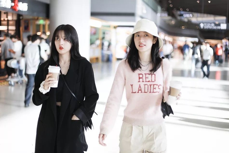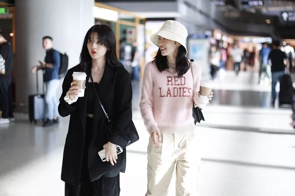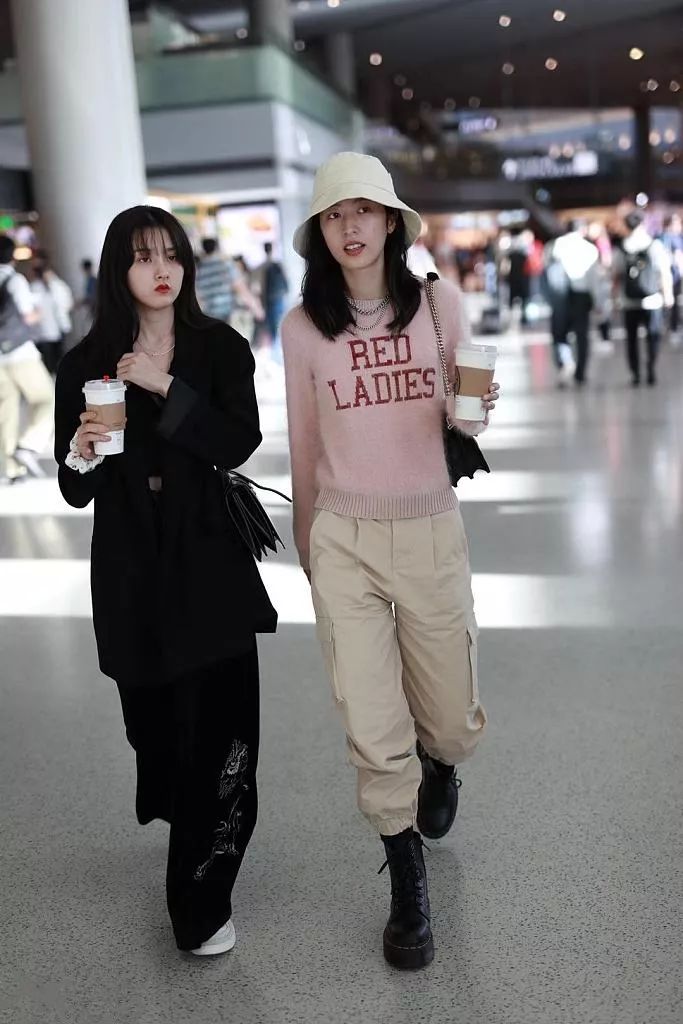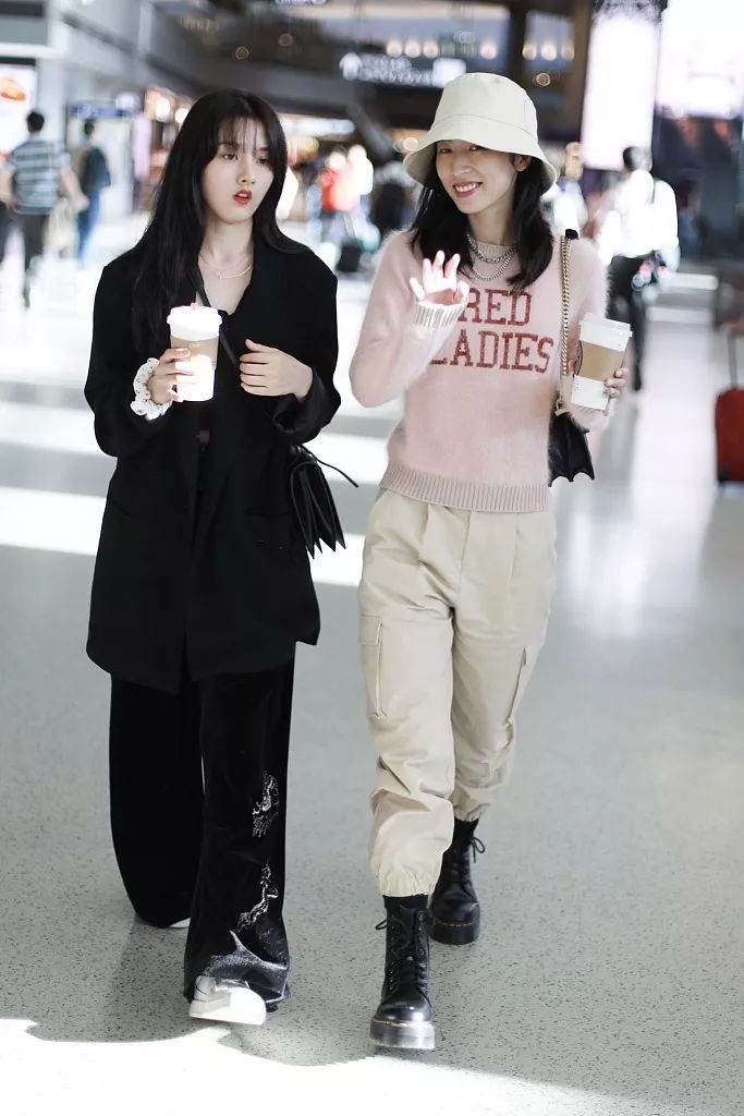 都知道机场偶遇不可怕,怕的是身为当下正火的小花来一个撞风格撞穿搭那才是尴尬!很显然这俩人默契演绎了一组闺蜜出街的范本搭配。之前提到过宋祖儿一套黑西装扮酷,周雨彤针织下搭配的也是酷劲十足的工装裤与马丁靴组合,手拿咖啡有说有笑不就是跟闺蜜逛街的样子么~