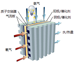图十五 质子交换膜(PEM)燃料电池结构和原理简图
